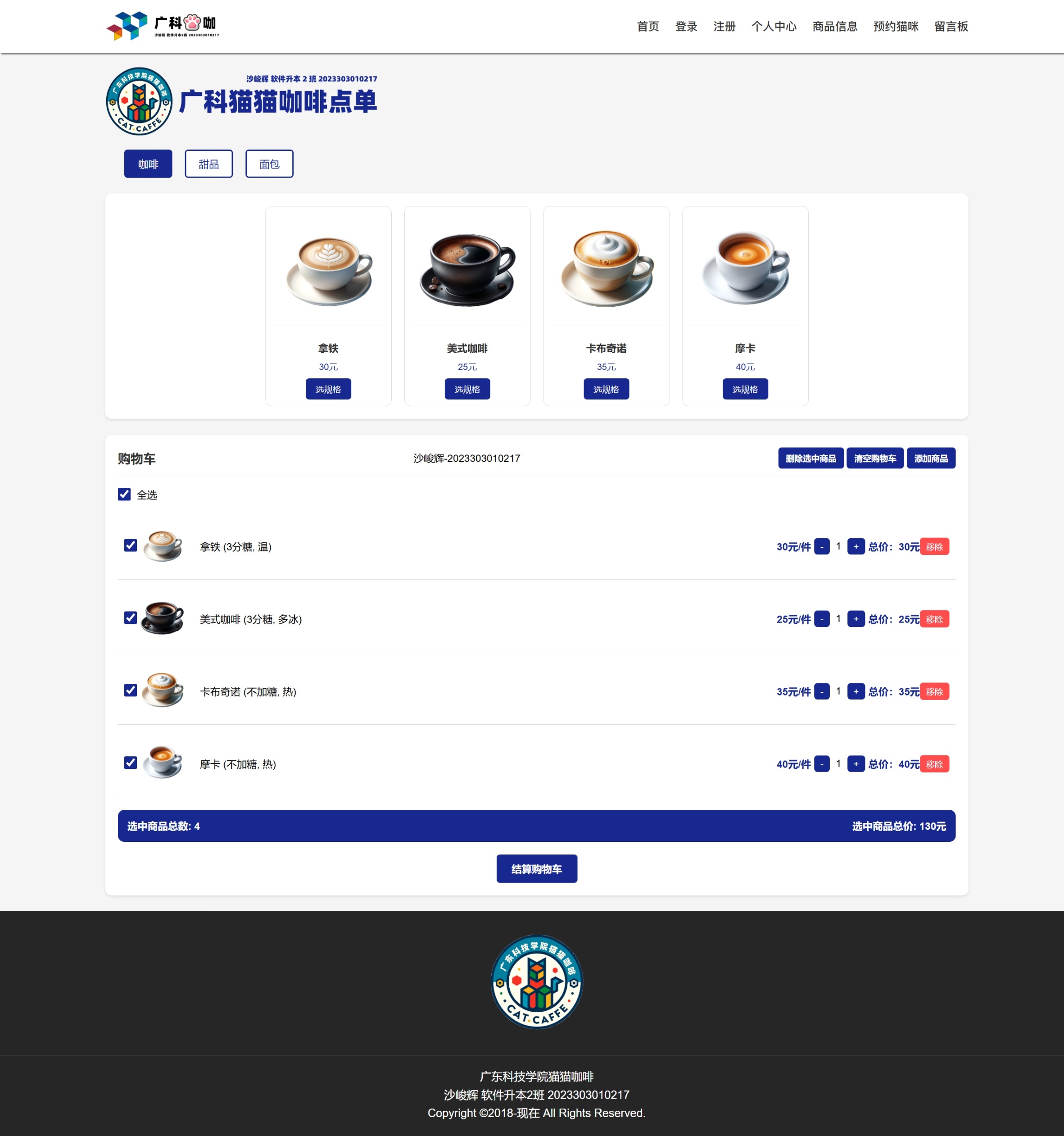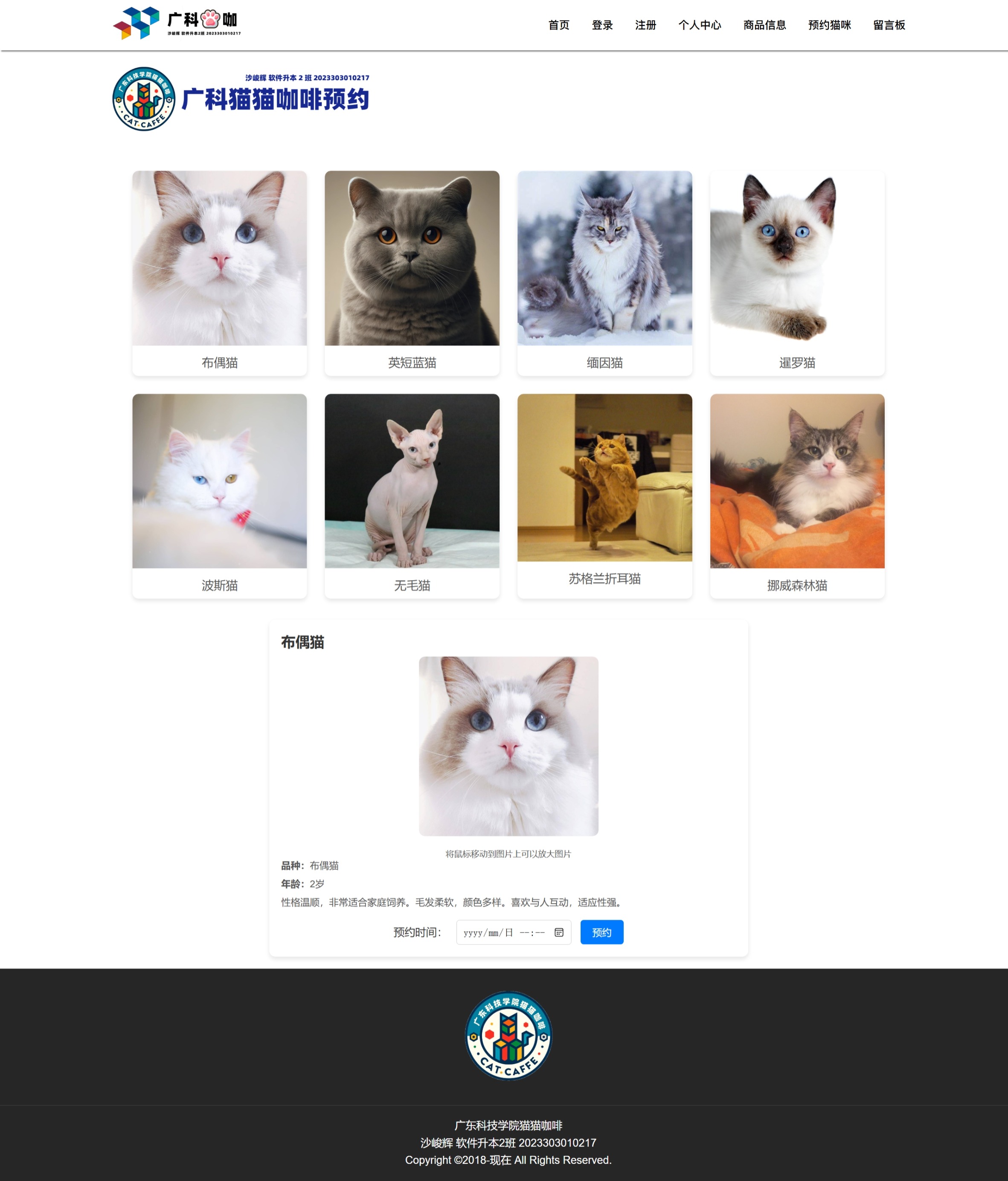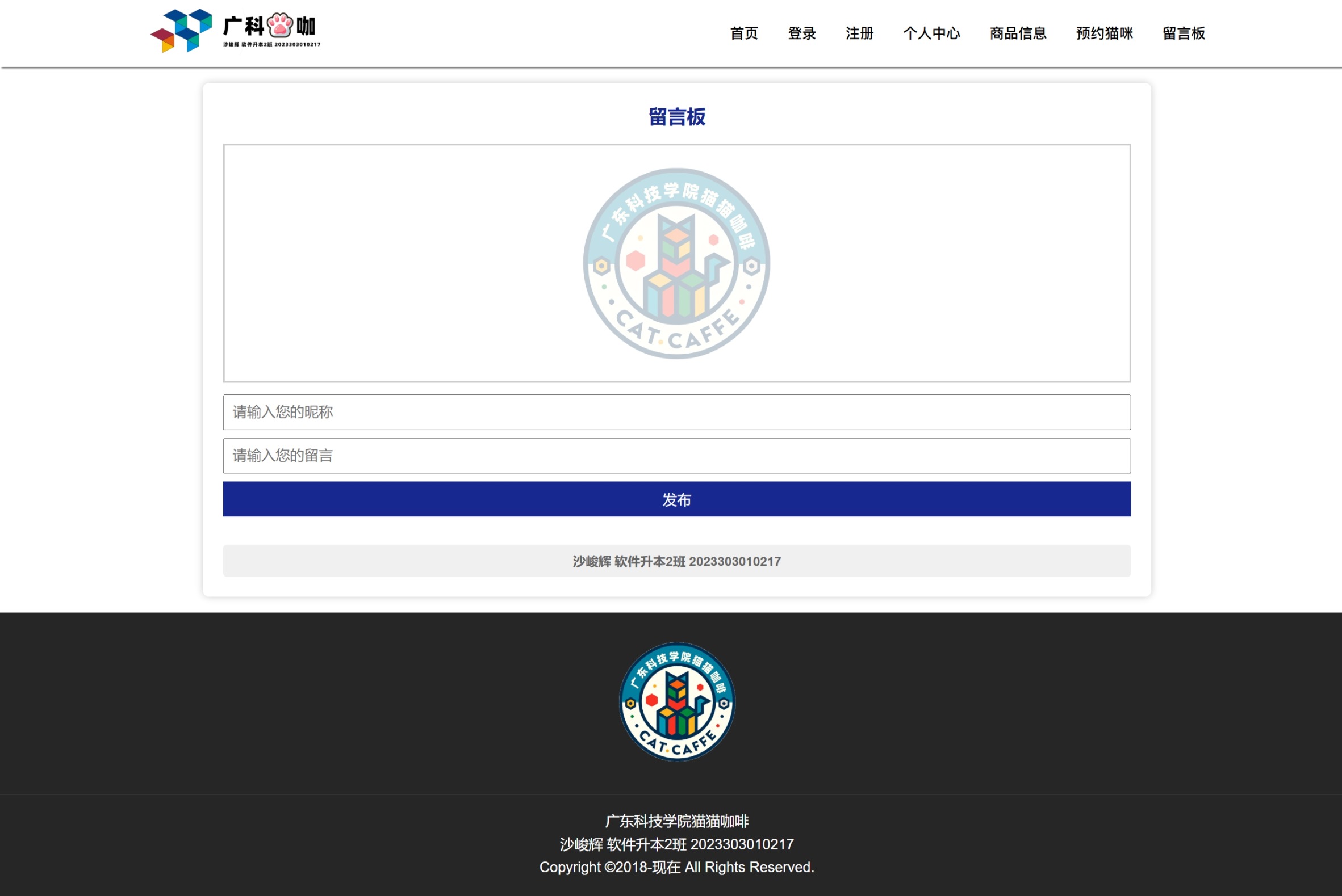 “广科猫咖”是一个偏“可逛、可点、可预约、可互动”的前端静态项目。它的灵感来自我在校期间经常看到校园里有很多小猫,同时“前端开发课程设计”的要求是为一家咖啡店制作网站来检验学习成果。于是我把广东科技学院的校园气质、咖啡店场景以及猫咪元素融合在一起,做出了一个结构清晰、交互完整的小站点,用来呈现我对页面布局、表单校验以及本地状态管理等基础能力的掌握情况。