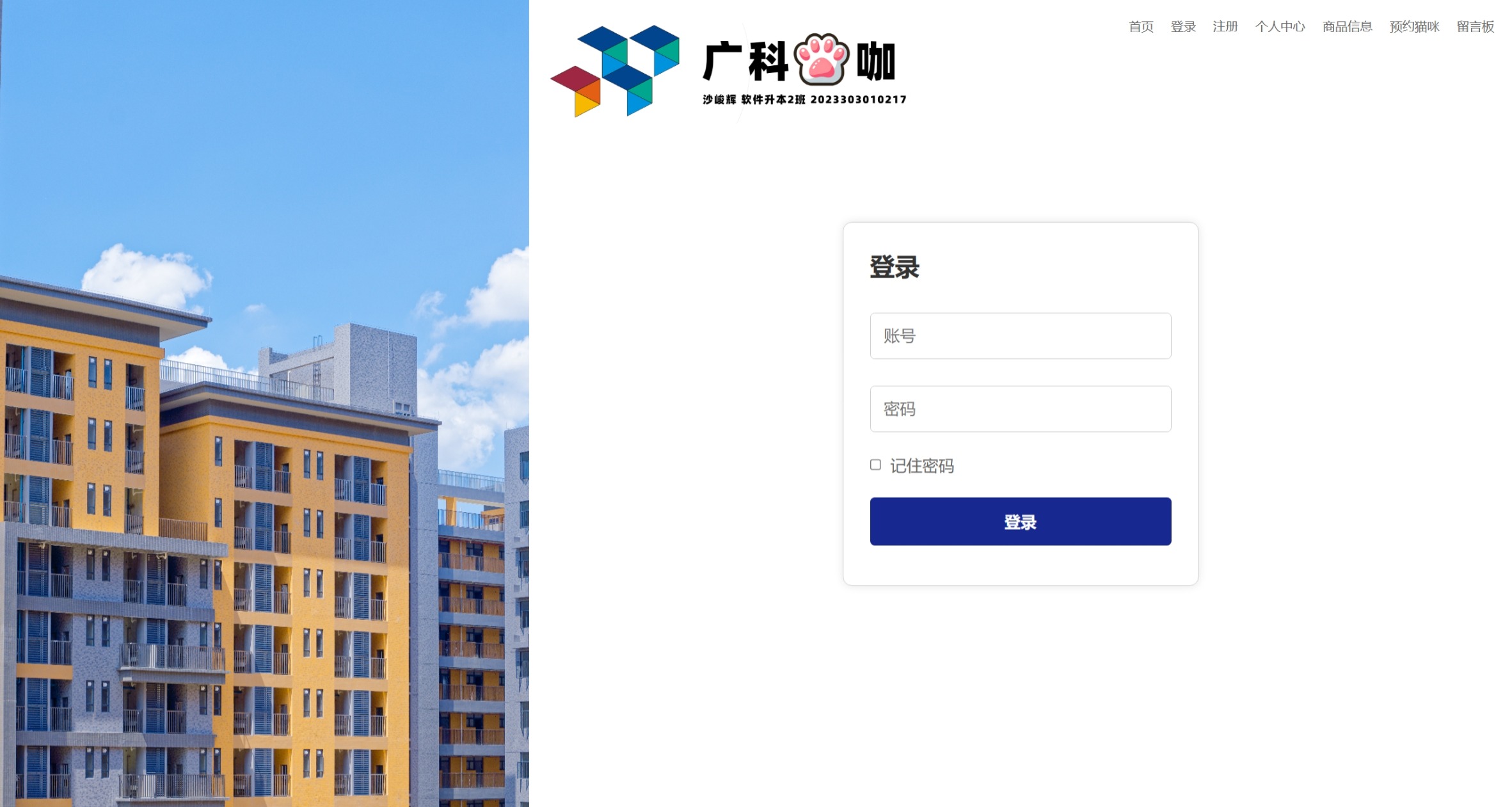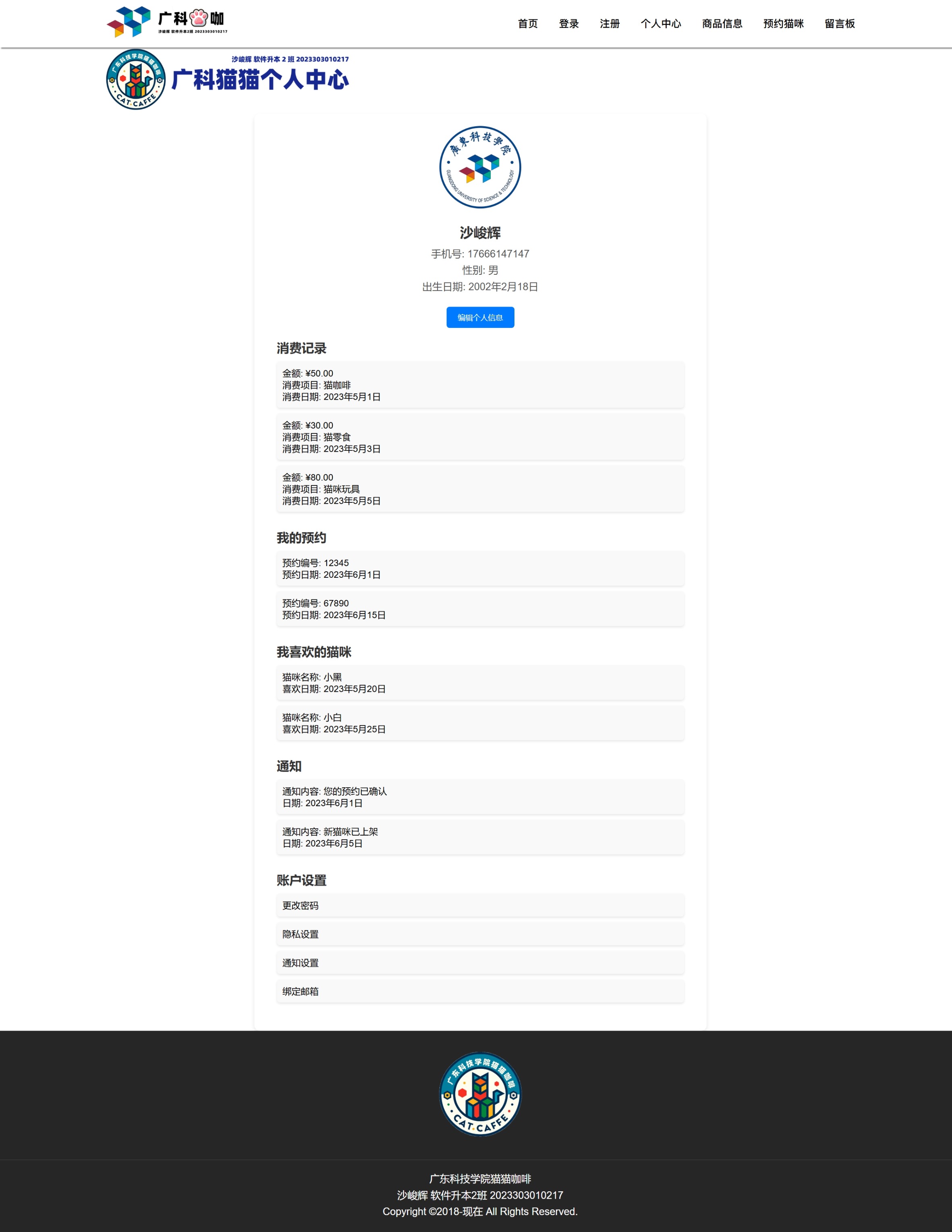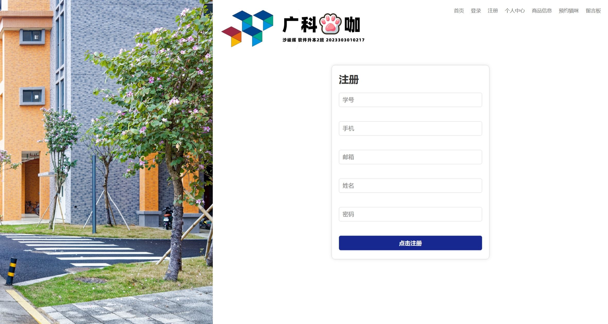 “广科猫咖”是一个偏“可逛、可点、可预约、可互动”的前端静态项目。它的灵感来自我在校期间经常看到校园里有很多小猫,同时“前端开发课程设计”的要求是为一家咖啡店制作网站来检验学习成果。于是我把广东科技学院的校园气质、咖啡店场景以及猫咪元素融合在一起,做出了一个结构清晰、交互完整的小站点,用来呈现我对页面布局、表单校验以及本地状态管理等基础能力的掌握情况。