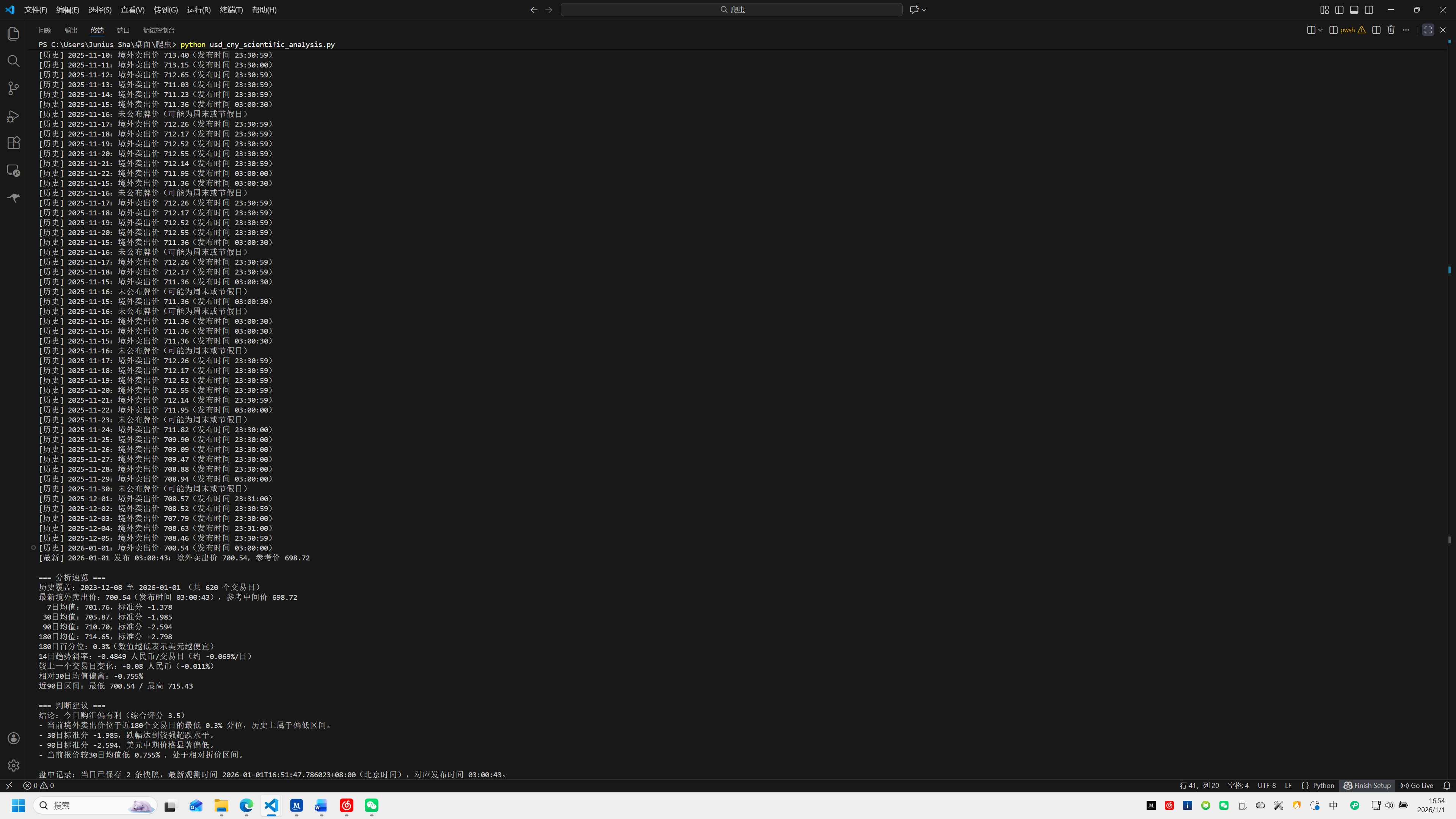 在每次运行时,脚本会先对缓存做完整性校验,并把缺失或异常日期加入回填队列,然后再计算分位数、标准分 Z-Score、趋势斜率等指标。最后它会把“今日是否适合购汇”的结论打印出来,并且同步输出触发结论的信号说明,便于我自己复核判断依据。